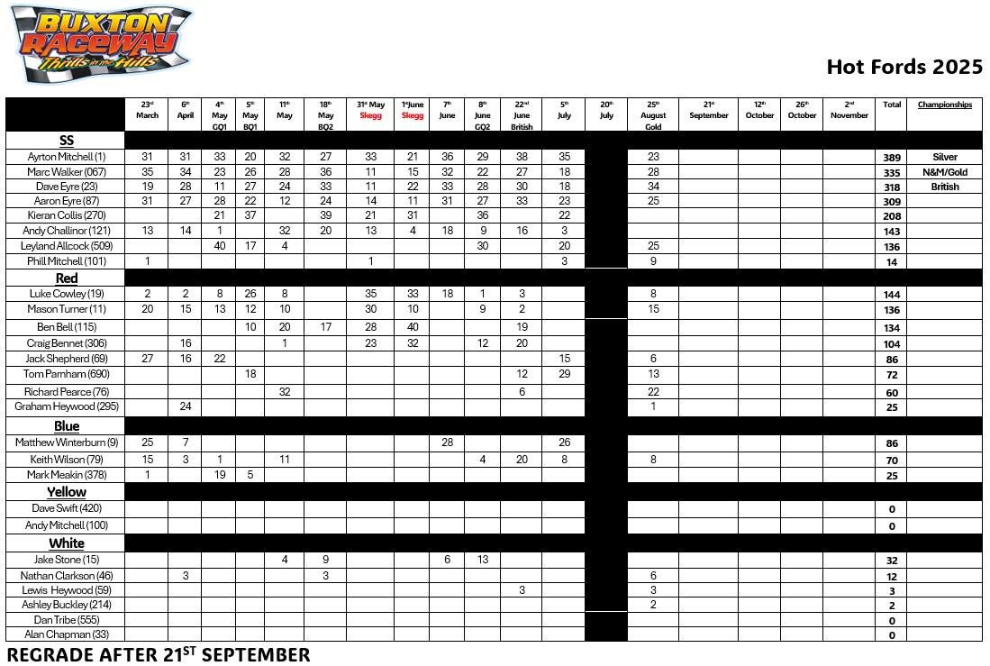 Up to Date Points for each Domestic Formula at Buxton Raceway
